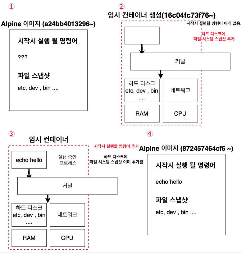 - BASE가 되는 이미지를 통해 임시 컨테이너를 생성한다.