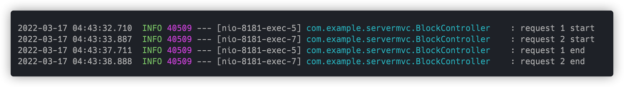 로컬에서 동시에 띄우기 위해 포트를 8181 로 변경하였고 /block/{id} API 를 요청하면 쓰레드를 5초동안 슬립시킨 후에 응답합니다.