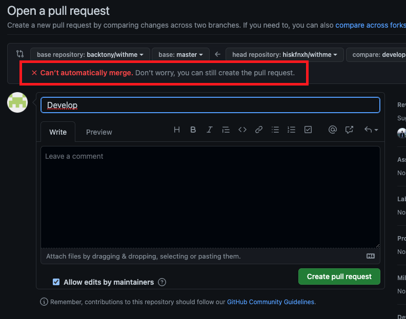 내가 로컬에서 작업하는 동안 누군가 upstream에 commit 했기 때문에 지금 pull request를 진행할 경우 merge conflict가 발생한다는 의미입니다.