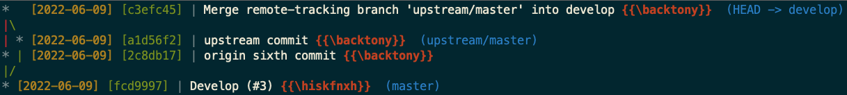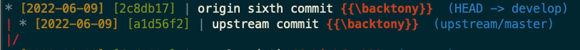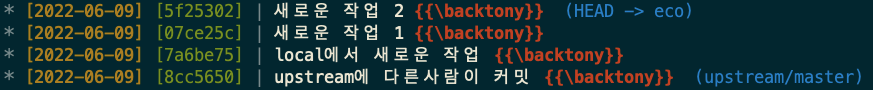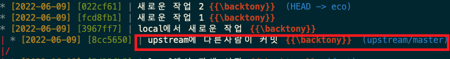 fetch로 가져오면 우선 아래 그림과 같이 upstream/master 에서 커밋이 발생한 것을 확인할 수 있습니다.