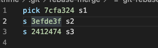 기준이 되는 시작 커밋만 그대로 두고 나머지는 앞쪽을 pick 대신 s로 변경합니다.