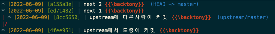 upstream의 master을 fetch해서 가져왔더니 하나가 추가된 것이 보이고 로컬에서는 기존 분기점에서 3개의 커밋이 추가된 상황입니다.