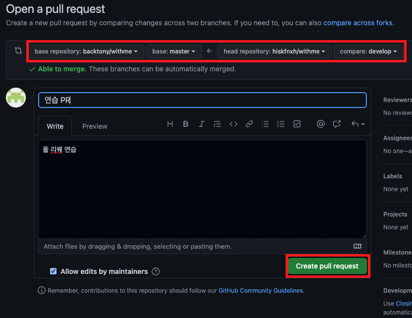 를 선택하여 pull request 방향을 정해주고 comment를 적은 뒤 create pull request를 클릭합니다.