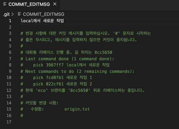 주석 처리된 내용을 읽어보면 현재 local에서 새로운 작업 커밋을 수정하고 있고 앞으로 새로운 작업1, 새로운 작업 2를 수정해야 한다고 합니다.