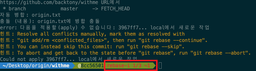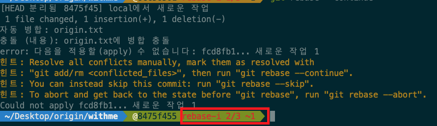 첫 번째 충돌 커밋을 수정했으므로 2/3으로 변경된 것을 볼 수 있게 이제 두 번째 커밋을 수정해줘야 합니다.