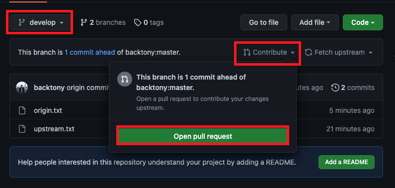 github의 fork한 프로젝트로 이동하여 develop 브랜치의 contribute를 클릭하여 pull request를 생성합니다.